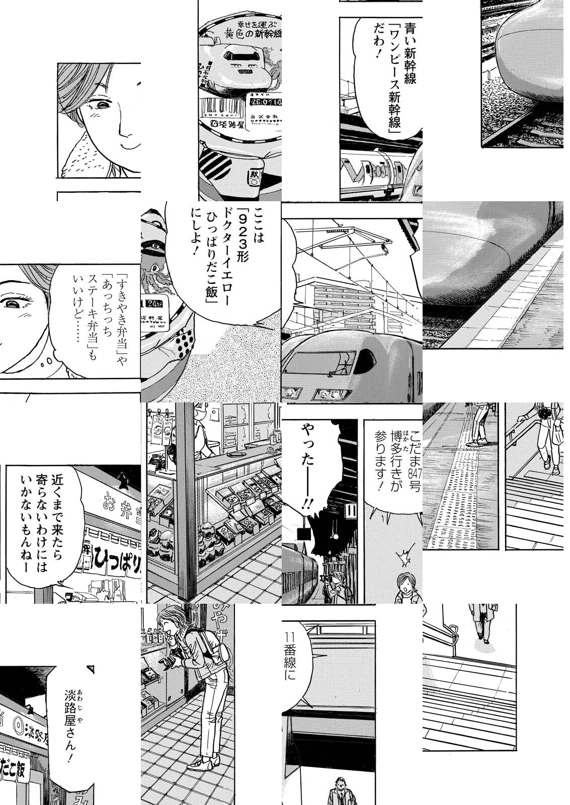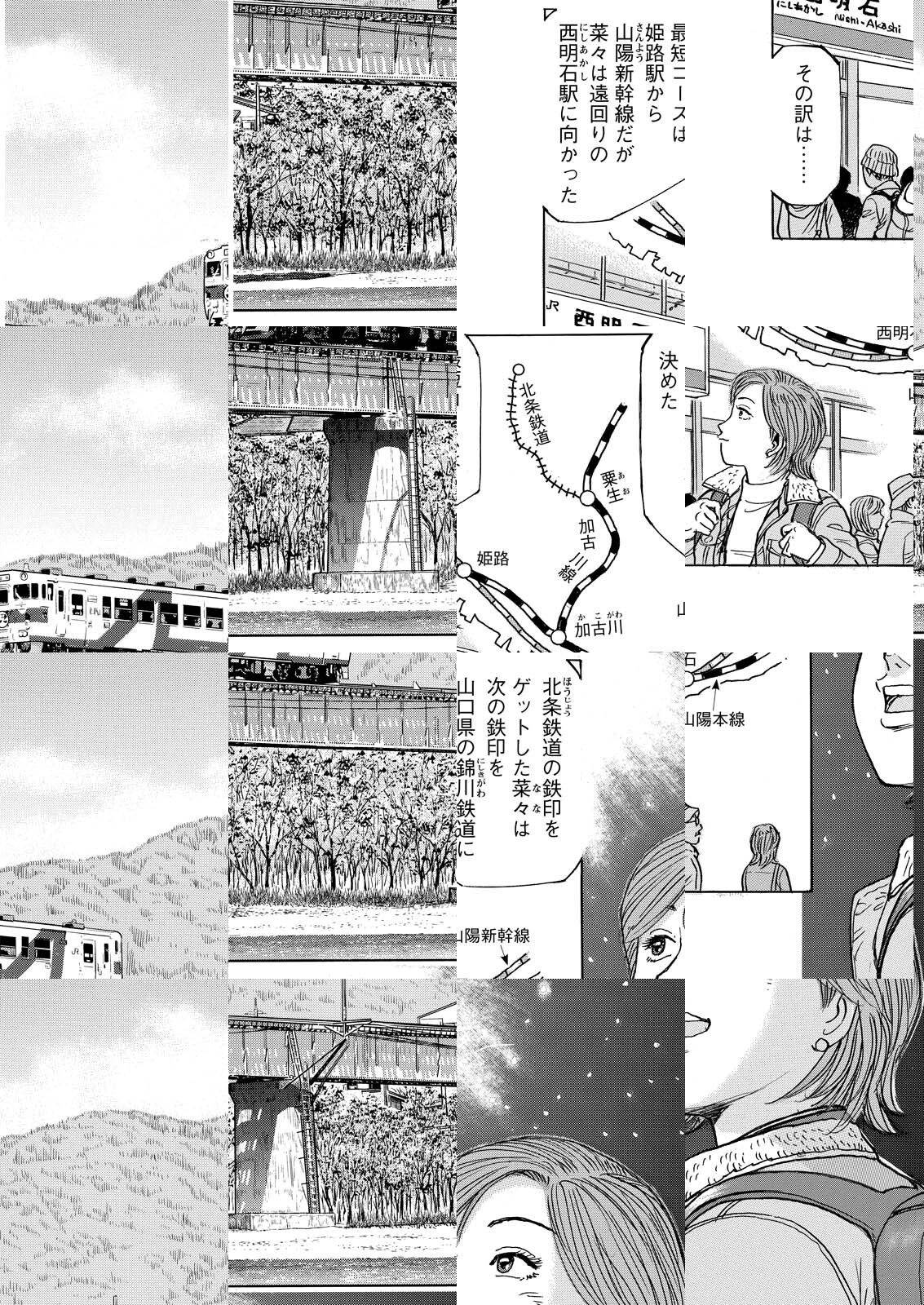 主人公は前作でサブキャラだった菜々。プロの鉄道カメラマンを目指しながら、フリーの駅弁ライターとして活動している。①巻ではJR九州の「或る列車」を撮影するところから始まり、関門海峡を徒歩で越えてJR西日本の新山口までを旅する。滋味深い駅弁の魅力と鉄道写真の奥深さを描いた物語。