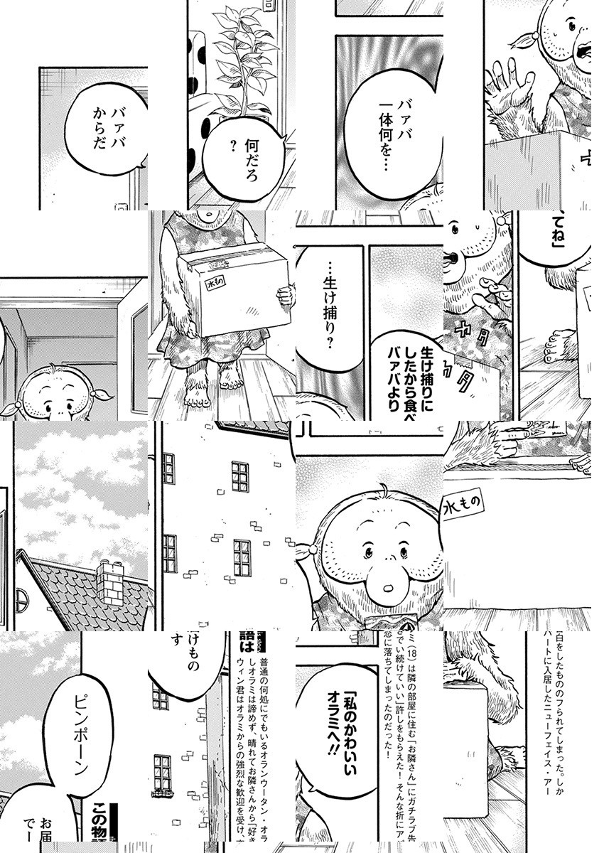 何処にでもいる普通のオランウータンの女の子・オラミ(18)は、最近隣に引っ越してきた人間の「お隣さん」に絶賛片想いなう!けれど昔から恋には奥手なオラミ…。なんとか距離を縮めたくて、日々全力MAXで奮闘中!!
