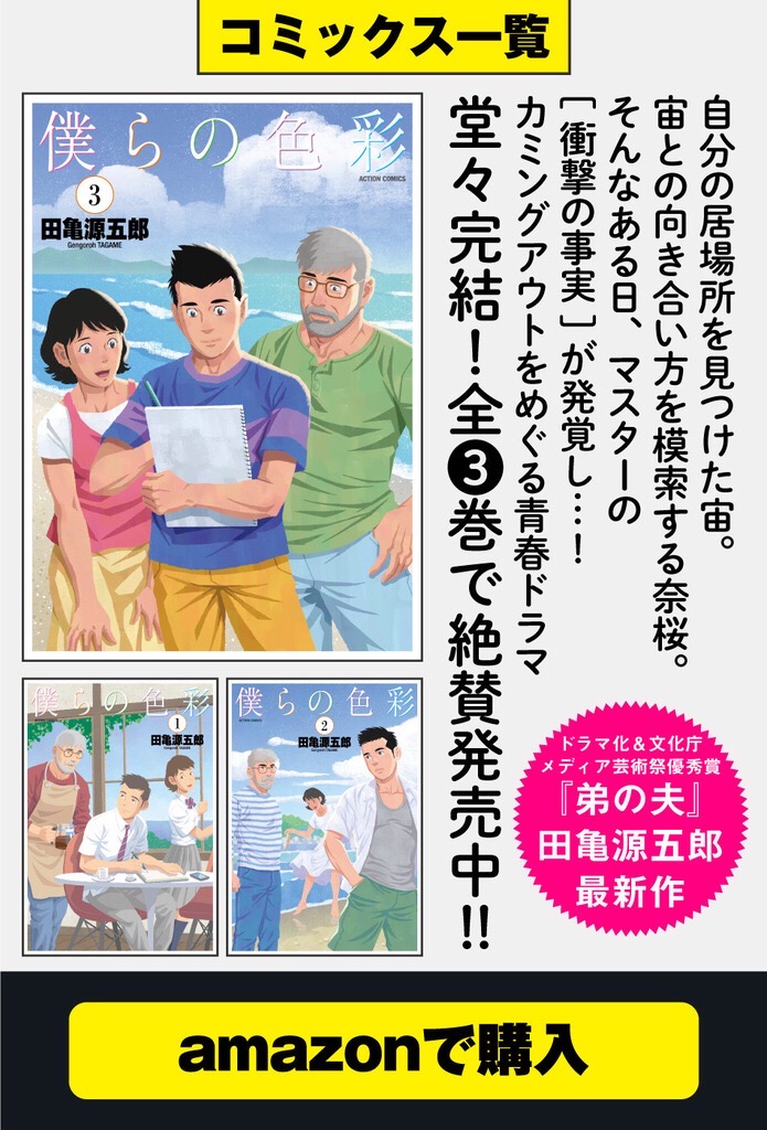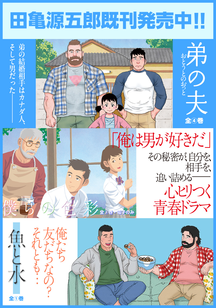 『弟の夫』田亀源五郎、最新作。高校生の宙はゲイであることを幼馴染の奈桜にも秘密にしながら、モヤモヤと過ごしていた。ある日、海辺で佇んでいると、年配の男性から突然「好きだった」と告げられ…心ヒリつく青春ドラマ