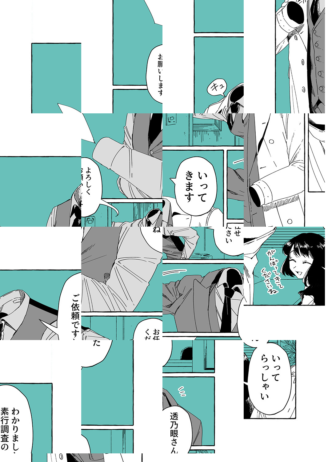 夜香さんが勤める探偵事務所の主は、スマートで優しい「透明男」の透乃眼さん。たとえ姿を消していても、目の見えない夜香さんには不思議と彼の居場所がわかってしまうのです。個性的な同僚に見守られて今日も赤面オフィスワーク♪