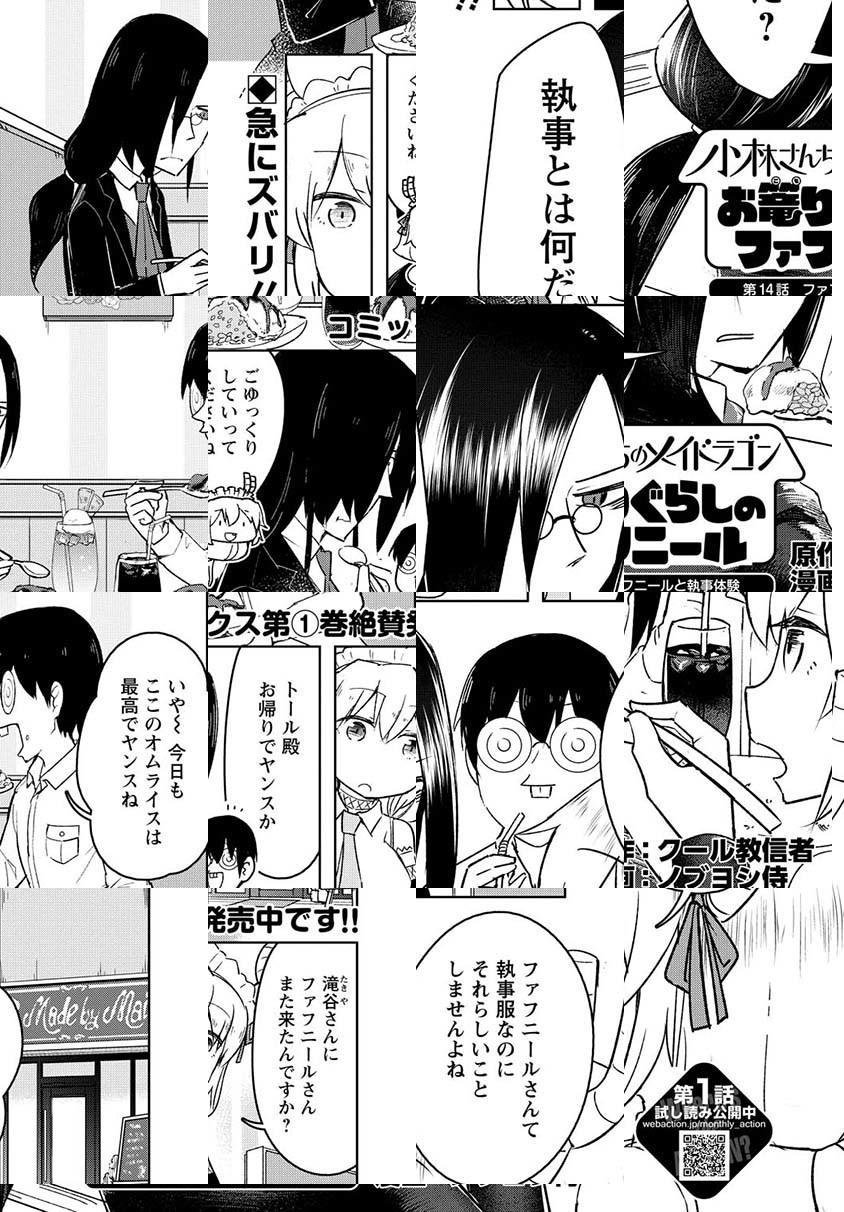 210万部突破の大人気人外系コメディ「小林さんちのメイドラゴン」のスピンオフ「カンナの日常」「エルマのOL日記」「ルコアは僕の××です。」「お篭もりぐらしのファフニール」が最初から読めちゃうお得なコーナー!